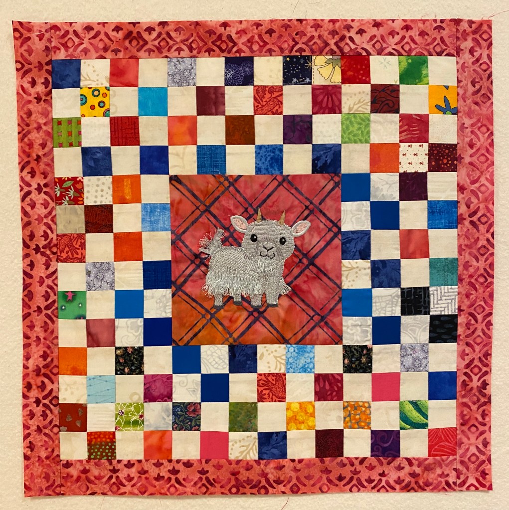 When I found a small stack of 1.5″ squares, already sewn into 4-patches, I knew they would make a perfect border for my small goat embroidery! So this is my mini-quilt number one.