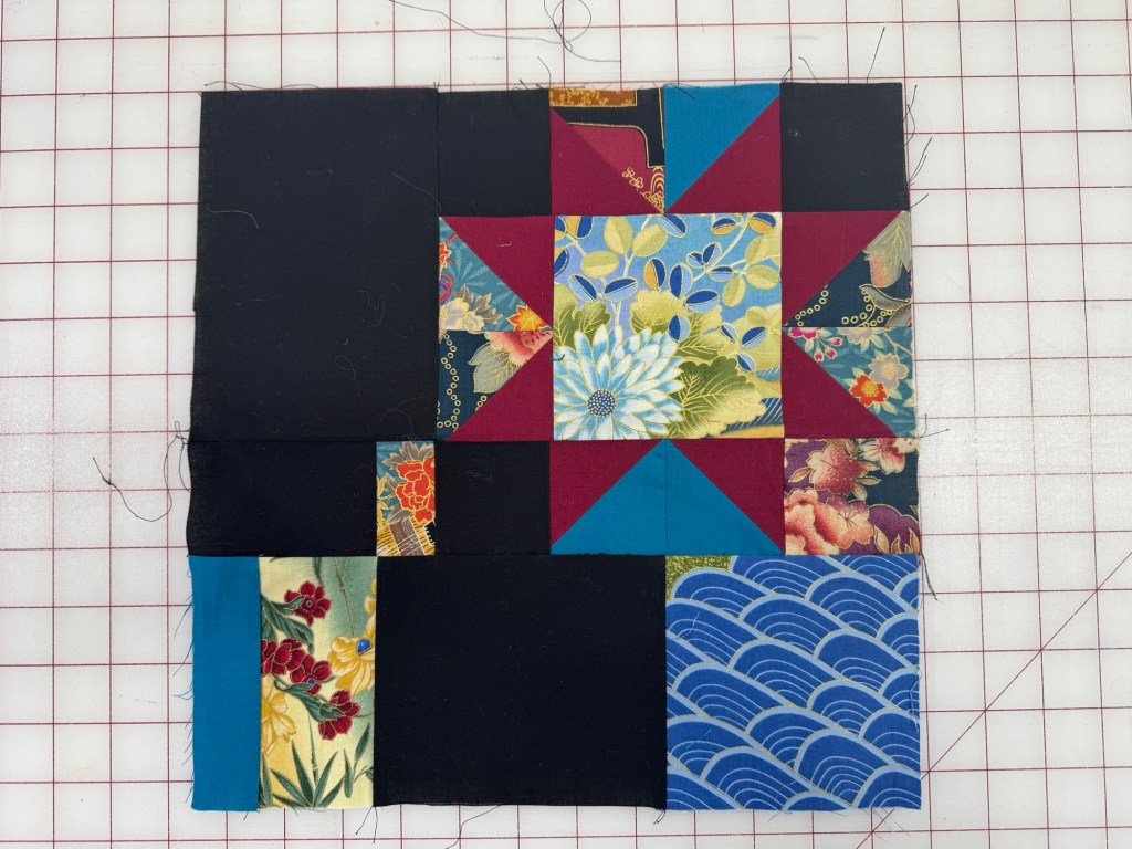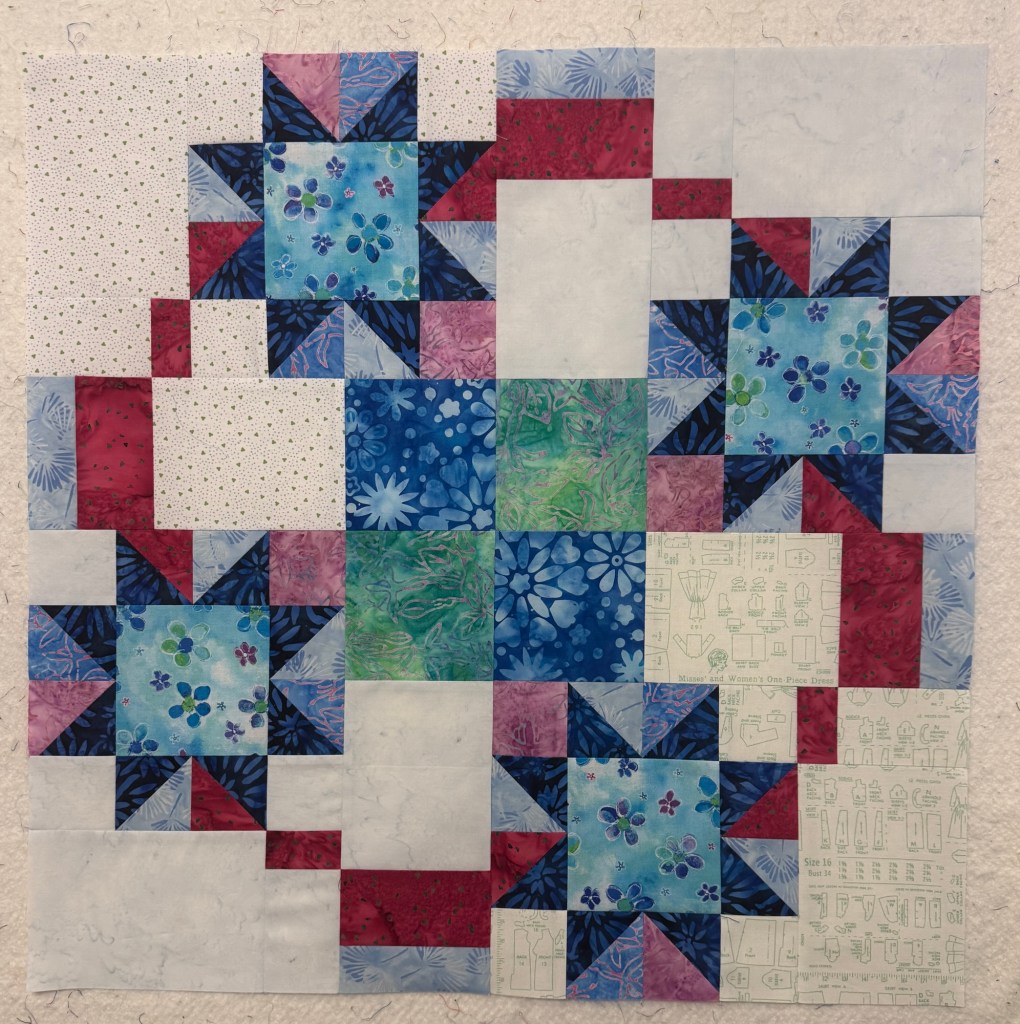 It took a long time for me to decide on what fabrics to use, so I only brought my fabric pull. After our meeting I made 4 blocks and selected a starting layout for the Experience quilt. As for my story… I tend to choose fabric combinations that are visually pleasing to me. When I first started quilting back in the late 90’s, that’s how I choose what to buy – by color and pattern, and how much I liked them together. Perhaps that is my quilting story – making quilts with fabrics that bring me joy!