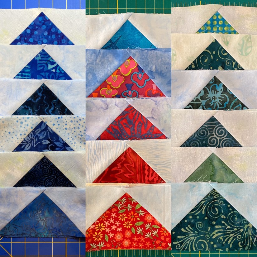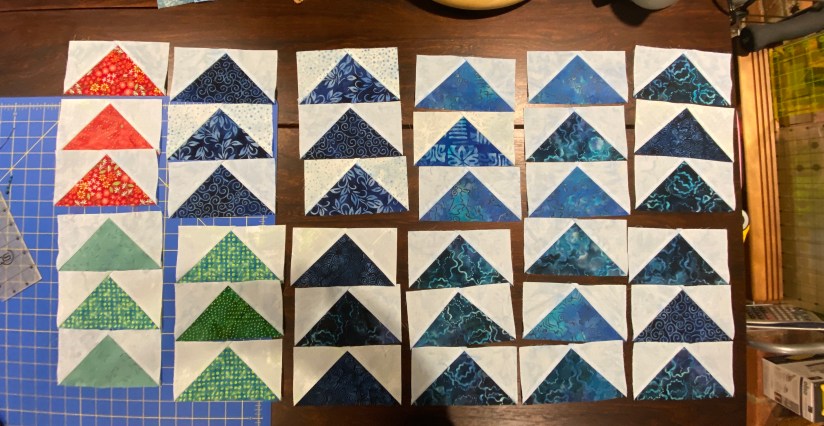 My version of the quilt will measure 99″ square and will require a total of 363 FG units. 243 will be sewn into 81 blocks and 120 to be used for the borders. I made progress on sorting, trimming and putting some of the units into blocks at the February Sit & Sew at my LQS. Then I put it aside again for a few months.