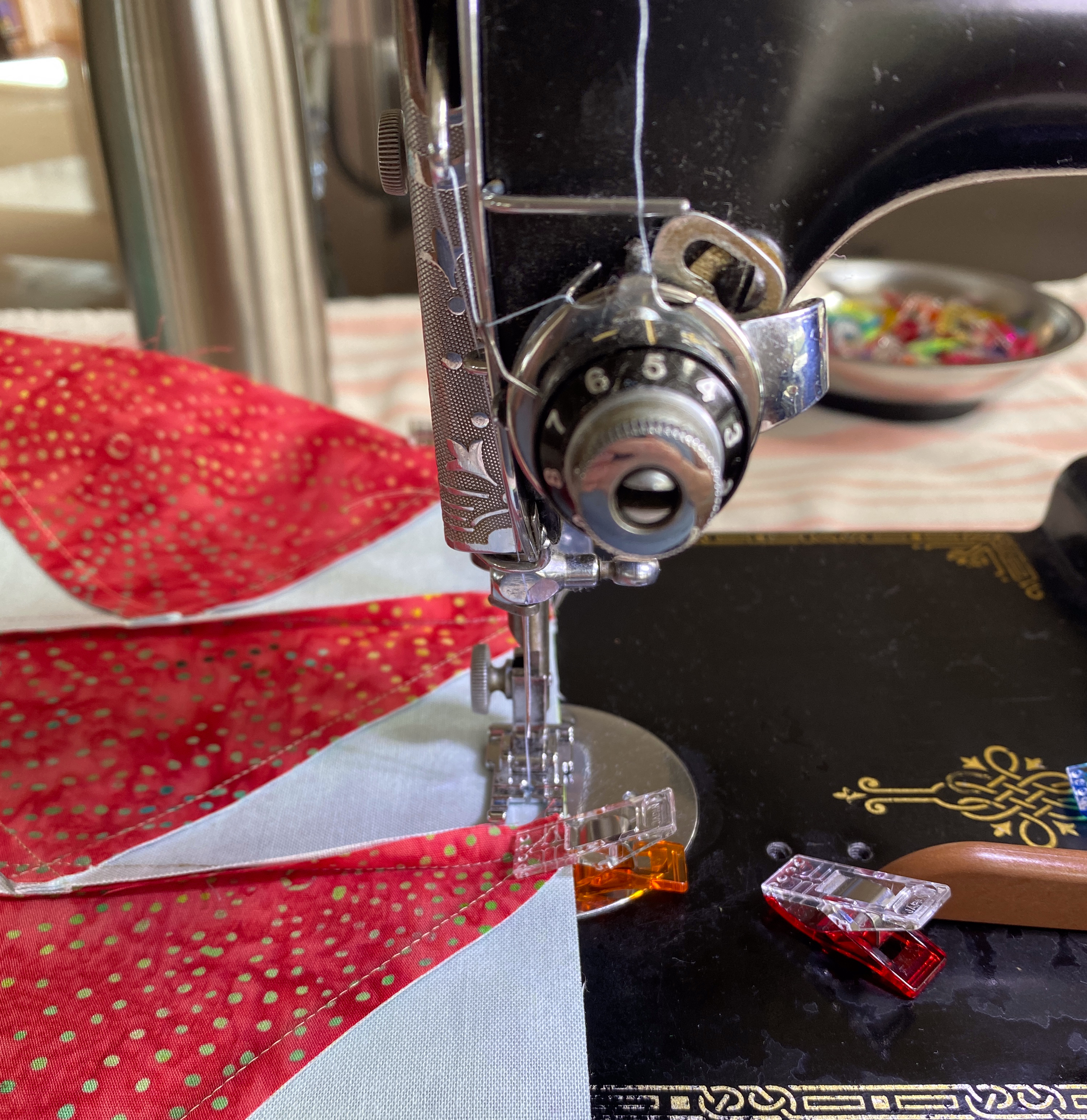 30 blocks are ready for sashing to be added. I’m working on the dining room table and sewing on my Featherweight.