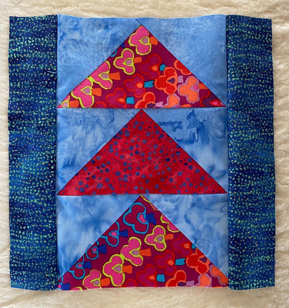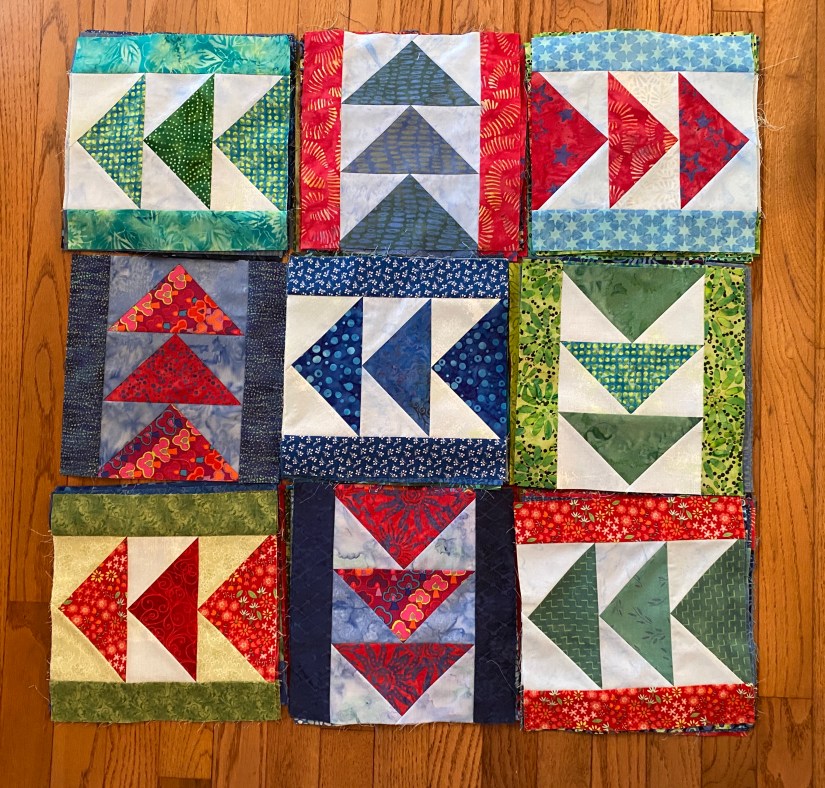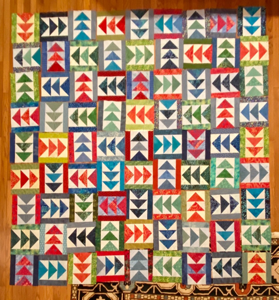 This quilt is made up entirely of Flying Geese (FG) units, 3″ x 6″ finished. They are combined into blocks of 3, with sashing strips added to the sides. Finished blocks measure 9″ finished and are rotated into different directions for placement. Borders will be made using long strings of FG units.