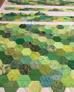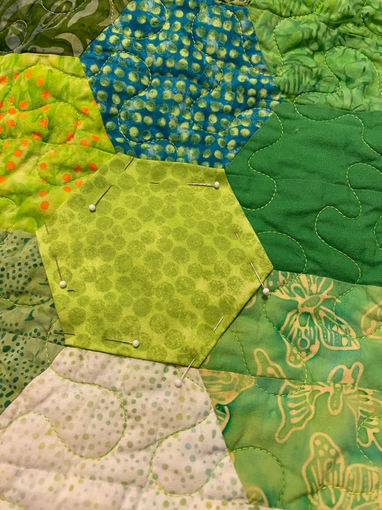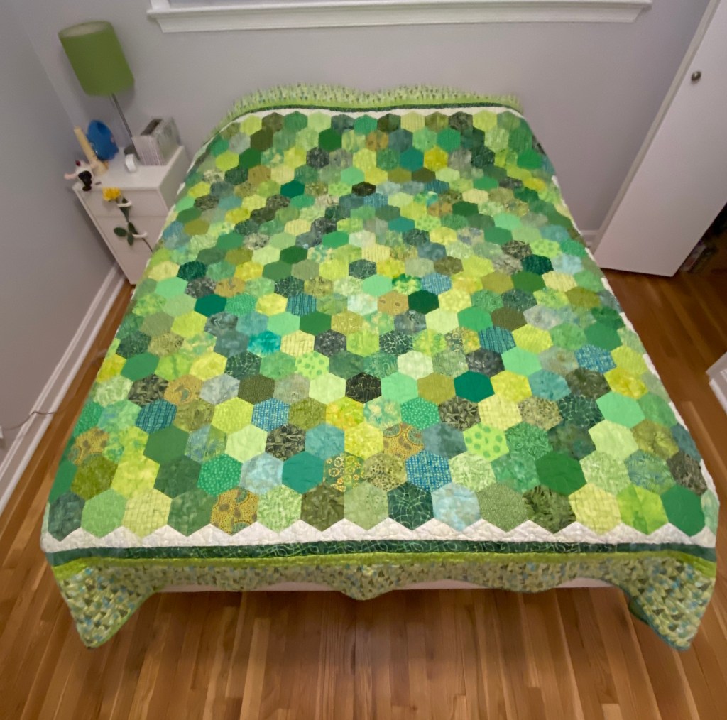 In April of 2019 I made a quilt for my son for his college graduation gift. He loves green, and I cut out hundreds of half hexagons from my extensive stash of green fabrics. I had to lay them out in rows on my living room floor, alternating light, medium and darks in a diamond pattern. I sewed half hexes in rows and then sewed the rows together. I worked every night for a couple of week to get the top assembled, because the layout took my entire living room floor and there was not place to walk. I found the perfect border fabric with green trees, I knew my son would love it too!