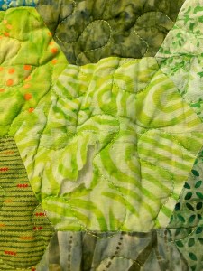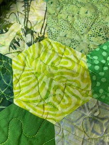 Imagine my incredible disappointment when later in the fall my son told me that he thought he had ripped the quilt and wasn’t using it! He brought it home at Thanksgiving, and looking at fabric tears in it nearly broke my heart! Apparently, one of the batiks that I used in the quilt was rotten, and it tore when when he washed it. This fabric was in 9 hexies and in the inner border, so the damage was pretty extensive. I cried… considered taking it apart, removing the rotten fabric patches and border strips, then re-quilting and reattaching the binding. I cried some more… There had to be a better way to fix this quilt!