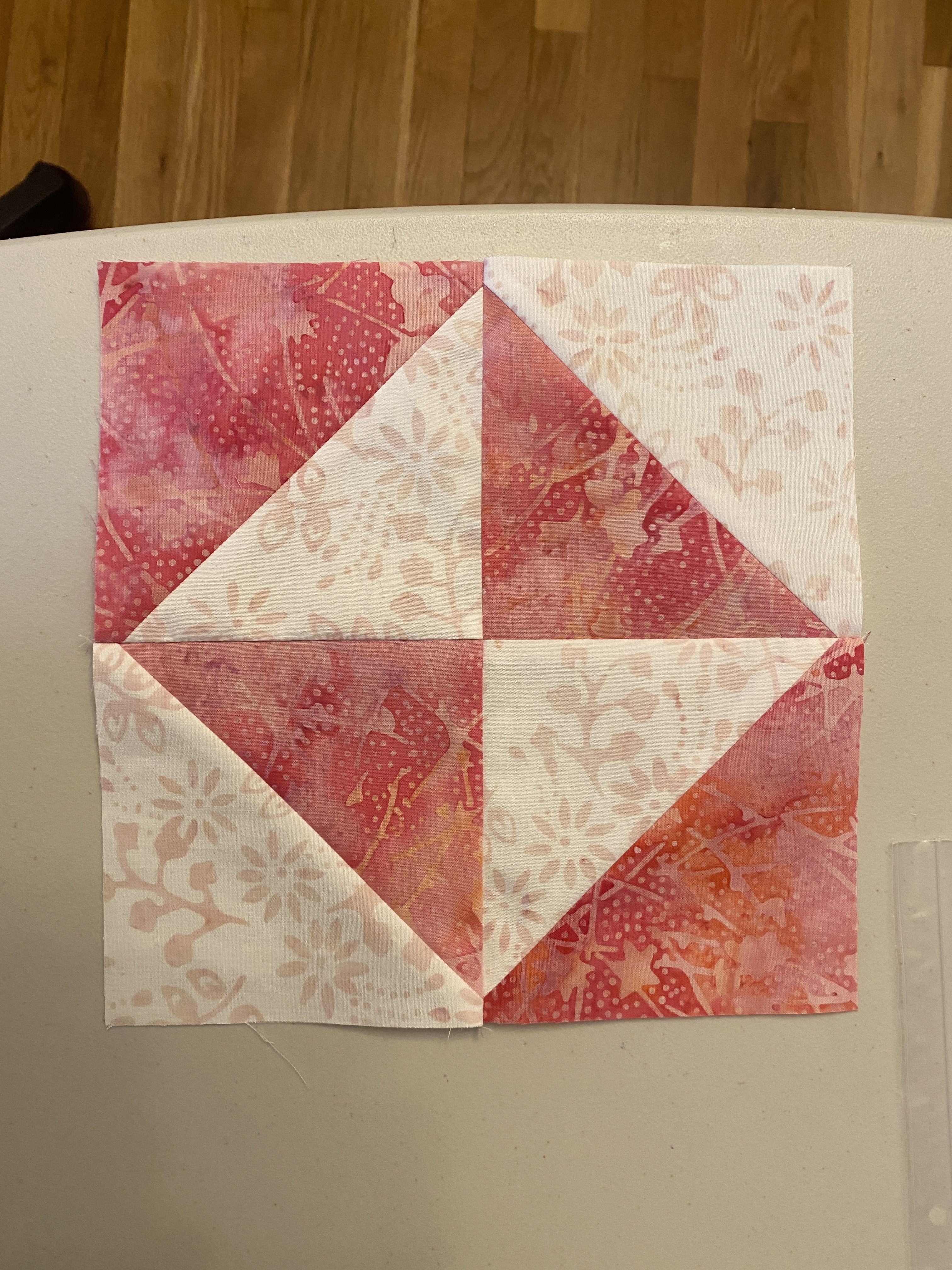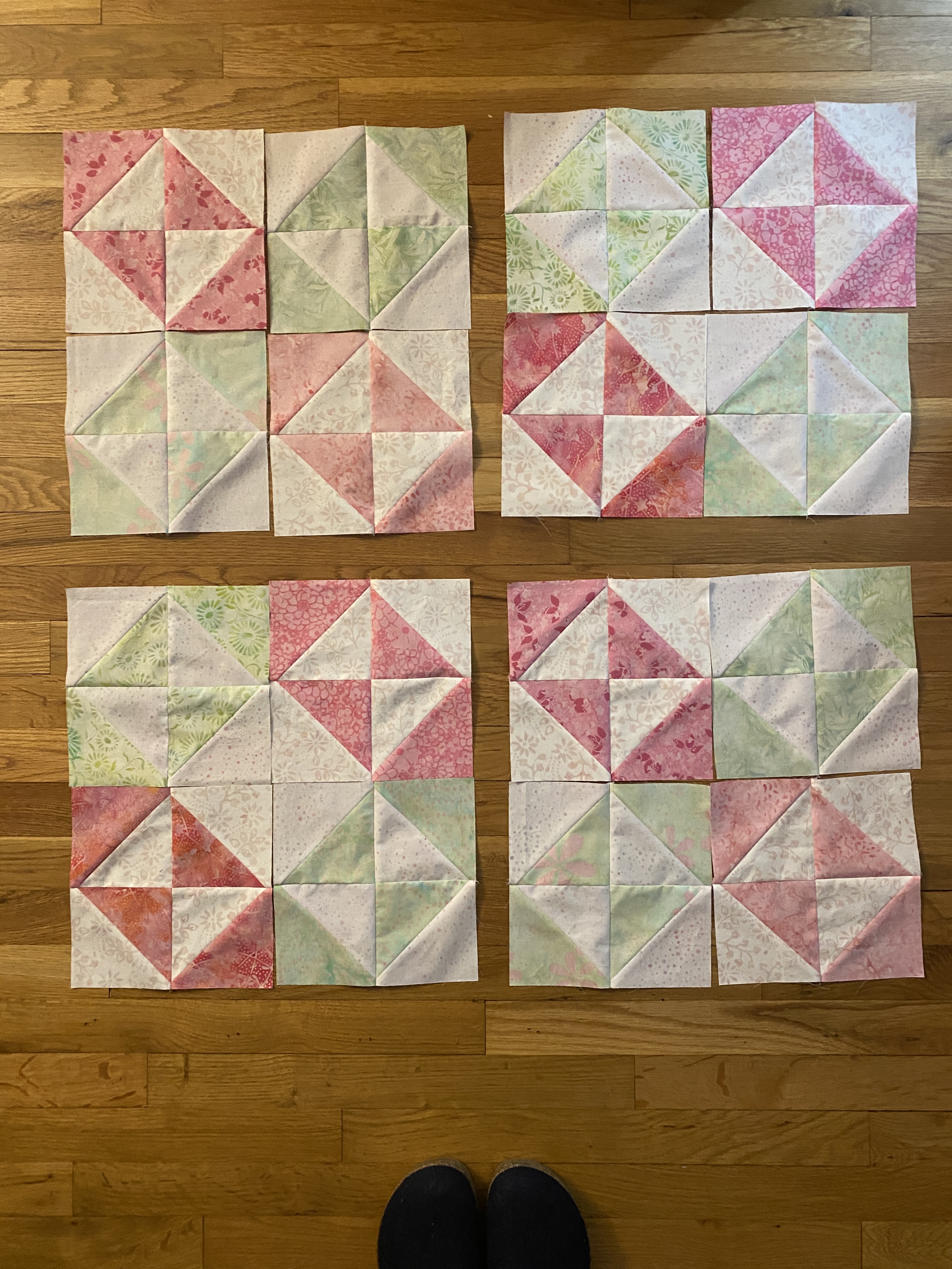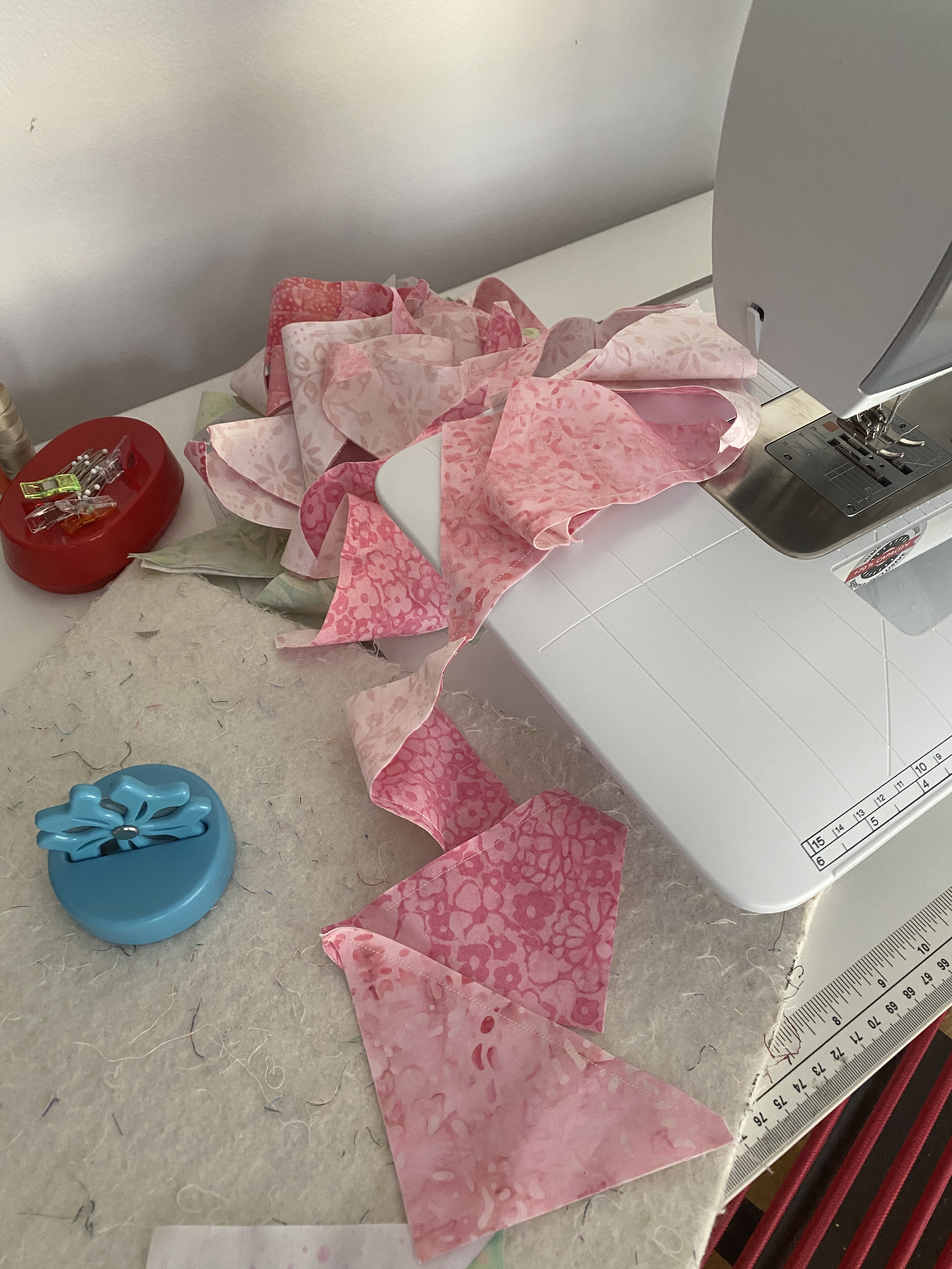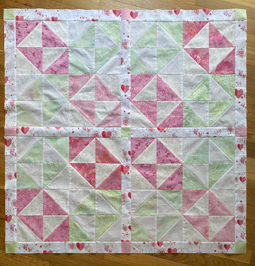 I used 4 strips of pink and 4 strips of light green – each 4.5″ x 21″, and 4 strips of background 4.5″ x WOF. I chose different backgrounds to coordinate with pinks and greens. All fabric came from leftover projects, the pinks & green are remaining strips from my 2Hearts QAL. Using Bonnie Hunter’s triangular ruler I cut out 8 HSTs from each strip set of color and background – that took about 30 mins. Then I chain-pieced them all at once, about 40 mins. Since there was no additional trimming, ironing and layout took about 40 mins. Next is to put 4 blocks together. I already chose the sashing – have some leftover pink & white hearts that I cut up into 12 strips of 2″ x 16.5″. I’ve searched thru the rest of my scraps for 9 x 2″ squares to use as cornerstones. Looking at more scraps, I found 4 strips for binding – 2.5″ x WOF.