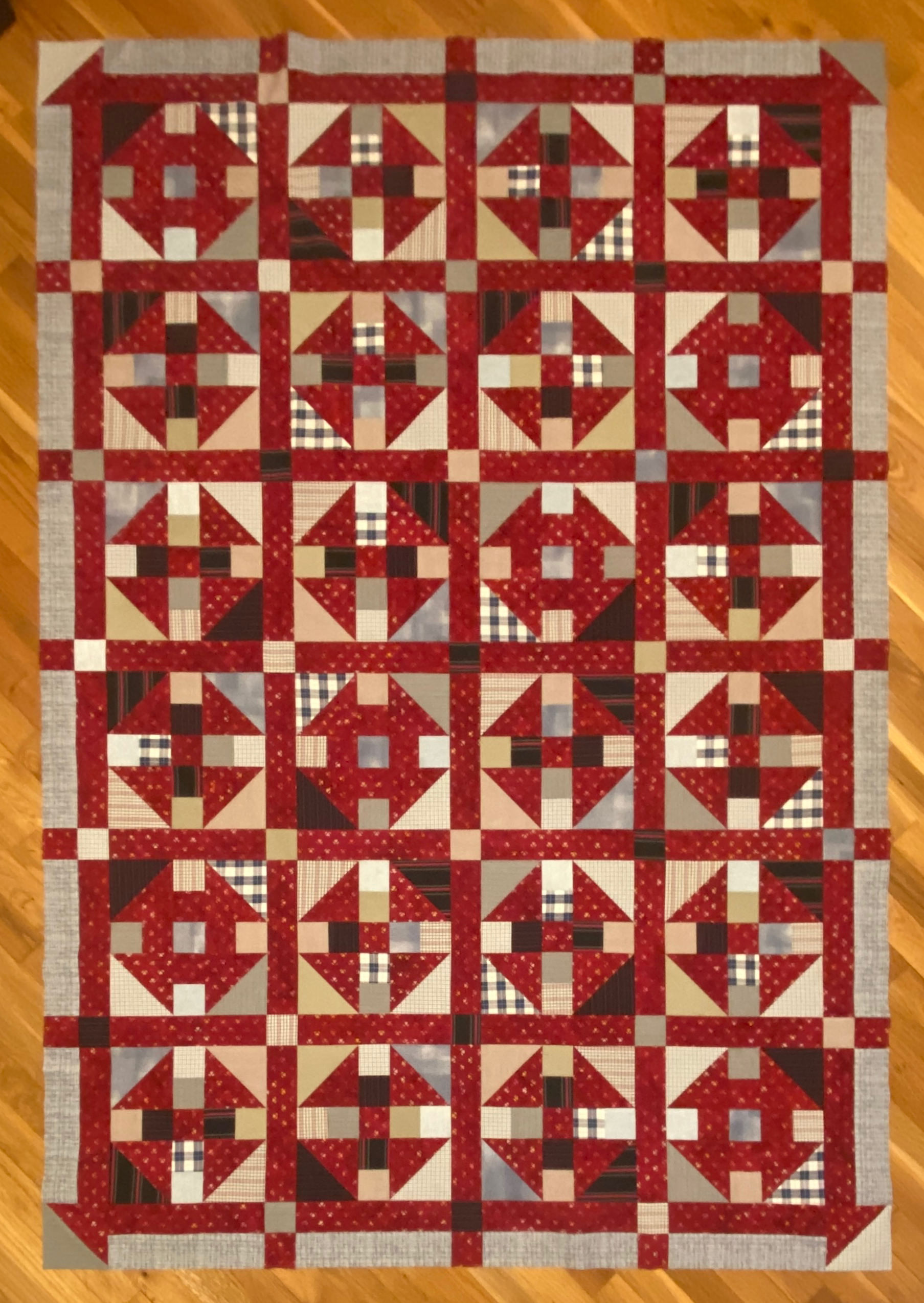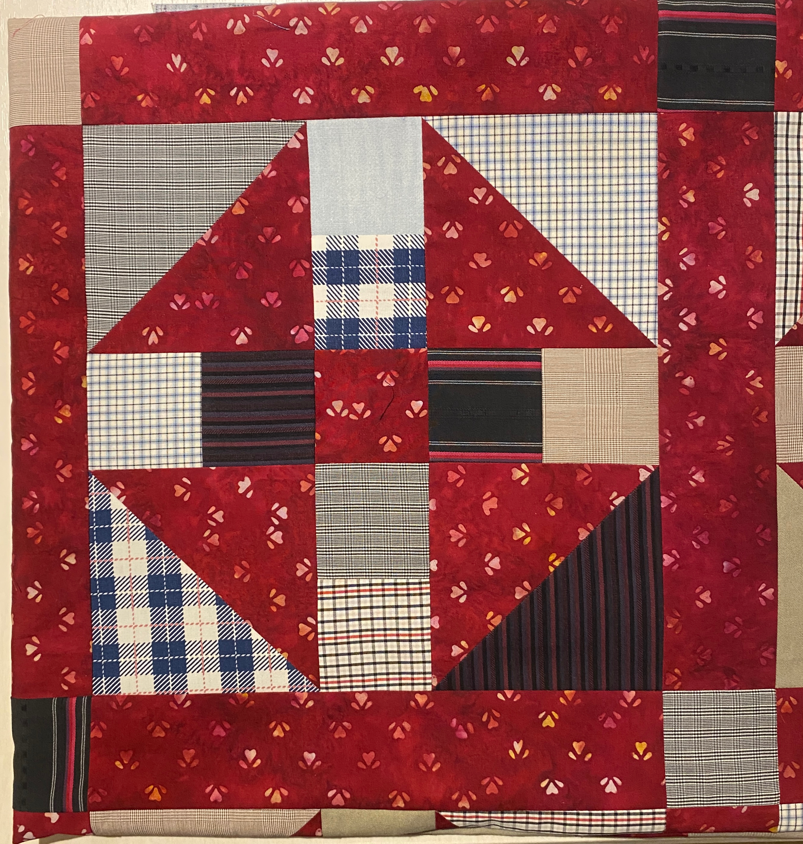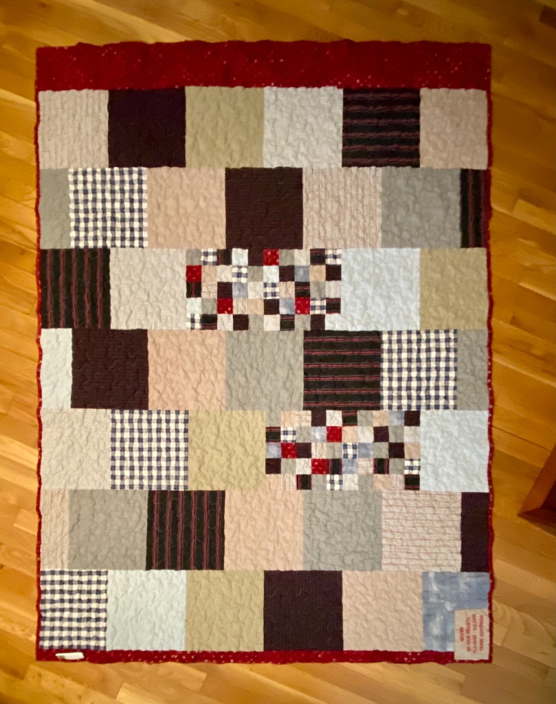 The front and back of the quilt is made from my Dad’s old shirts. There were about a dozen cotton shirts, and I was surprised at how much fabric is in every one! Because two of them were dark, I added a crimson batik with tiny hearts for background to help every shirt “pop”. The backing is made with 10″ squares from the backs of the shirts and some of the leftover 2″ squares.