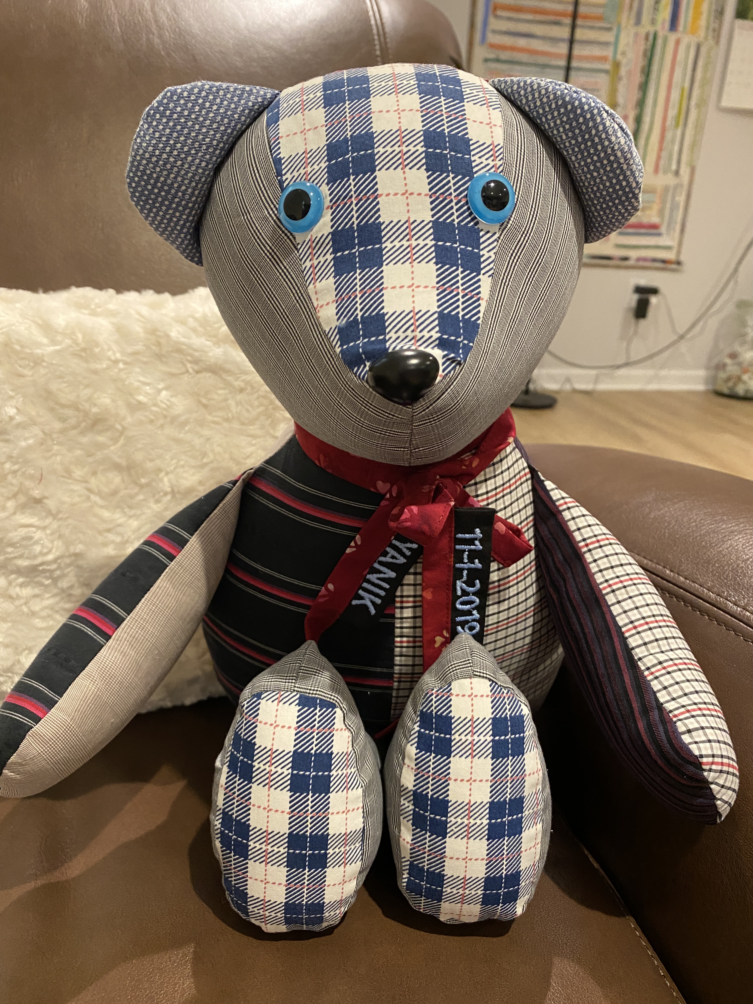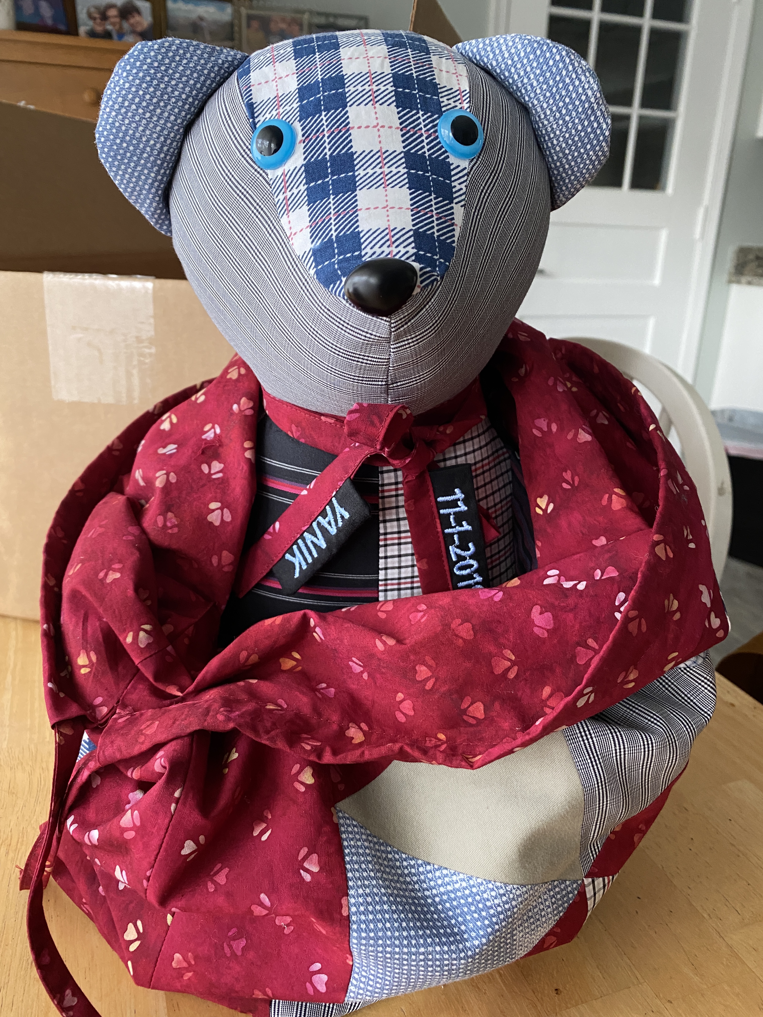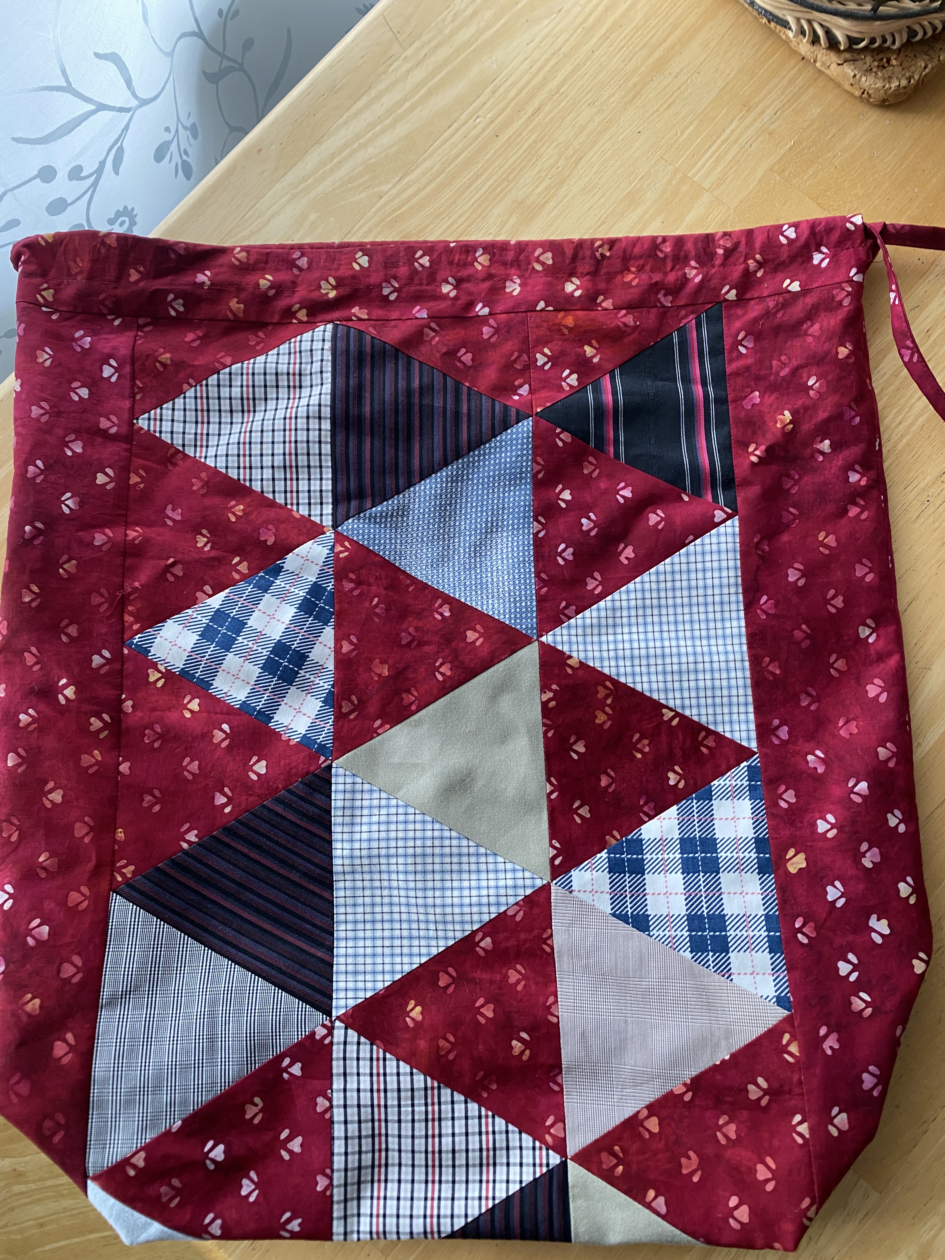 I got this idea from Erica Selman on YouTube and bought the pattern on Etsy on her recommendation. She has a great tutorial on how to make and stuff the bear. This bear will be a keepsake for my brother and now my nephew. The gift bag is made from the leftover triangles after making the first memory quilt.