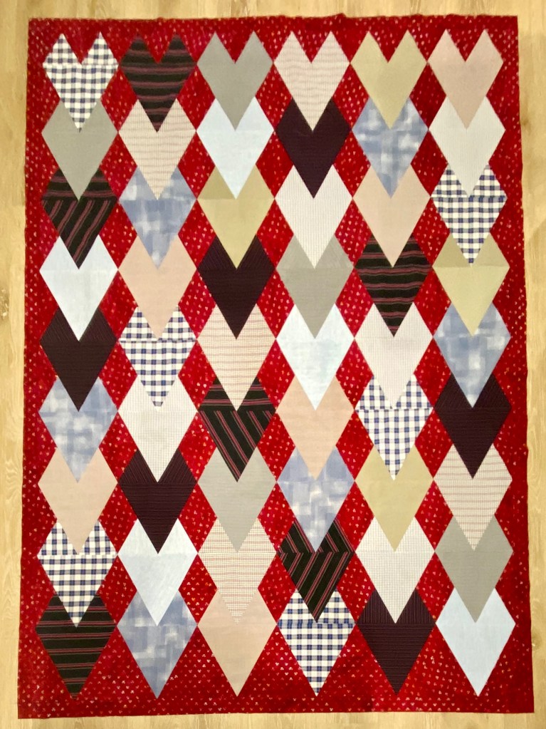 There is no pattern for this quilt, I worked off a picture I saw online and figured out the layout. I used a 60″ ruler to cut 8.5″ large triangles and 4.5″ small triangles for the hearts. The more challenging part was figuring out setting diamonds, which I made from 4.5″ strips and subcut with my Striplogy ruler (by Gudrun from GE Designs). I laid out all blocks first and then assembled in rows, joining one small triangle to one setting diamond, then joining that unit to the large triangle across the row. Each row was pressed in alternating direction to help nest the seams. Ripping old shirting can be dangerous, as the material is fragile, which I realized after some time with my seam ripper, ugh, so I pinned every point and then the assembly was quick and painless!