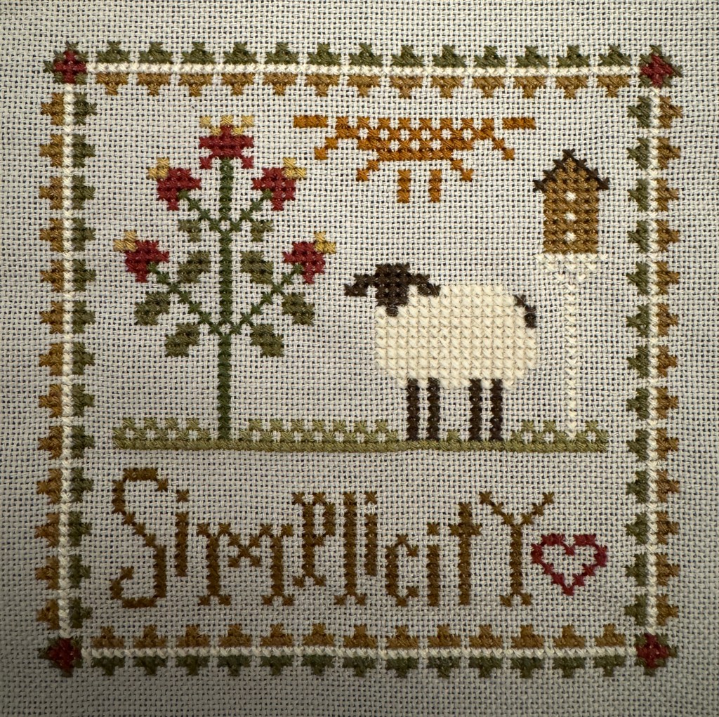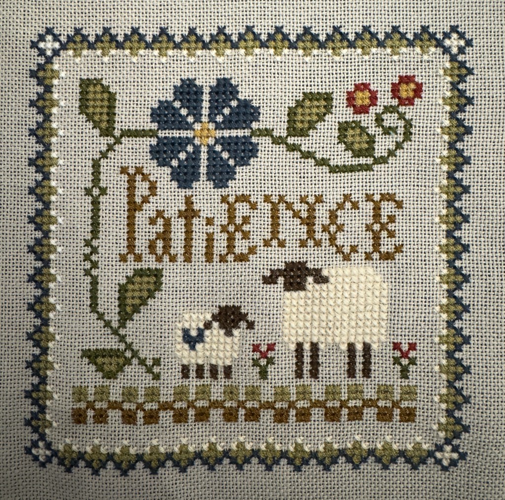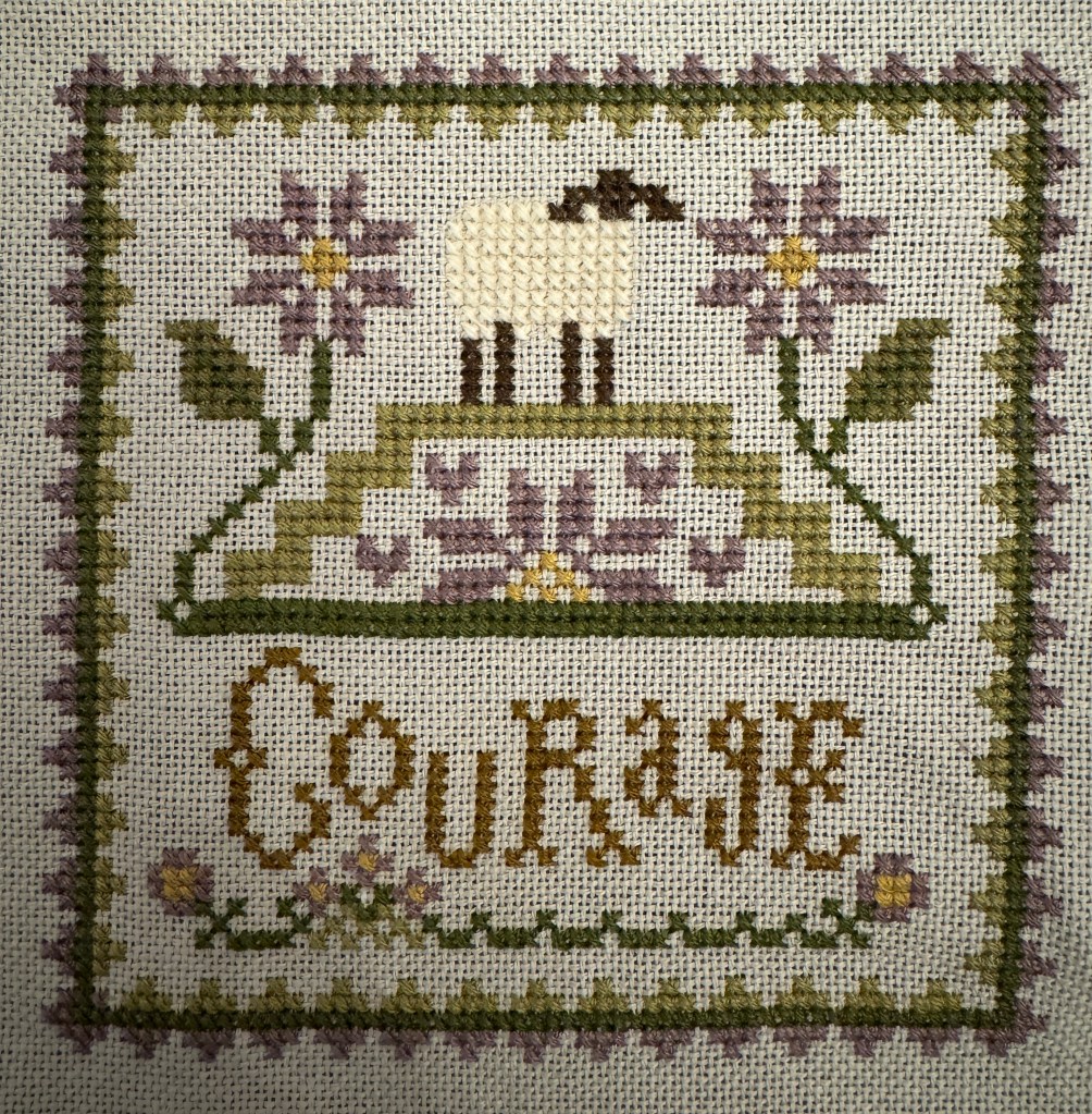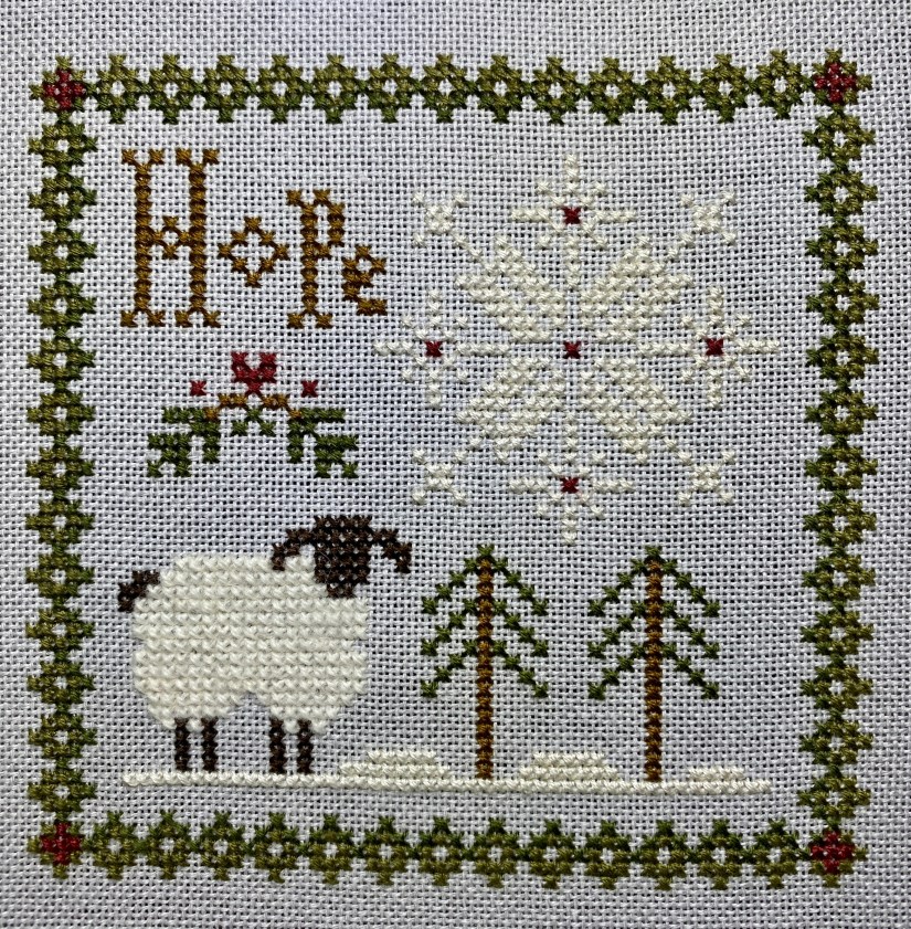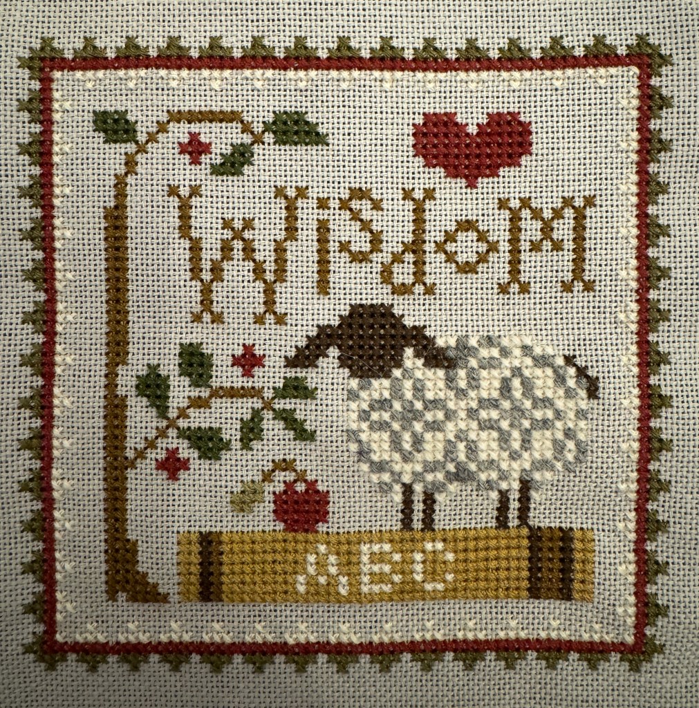 All 12 will be stitched on one piece of grey 28ct evenweave cloth and I will have it framed, when completed. I’m “interviewing” different wall spaces for placement of the final piece. So far it looks like my office will be the “sheep” room! I have a couple off sketches I picked up at the Sheep and Wool festival last year that need frames and will look very nice around me as I work.