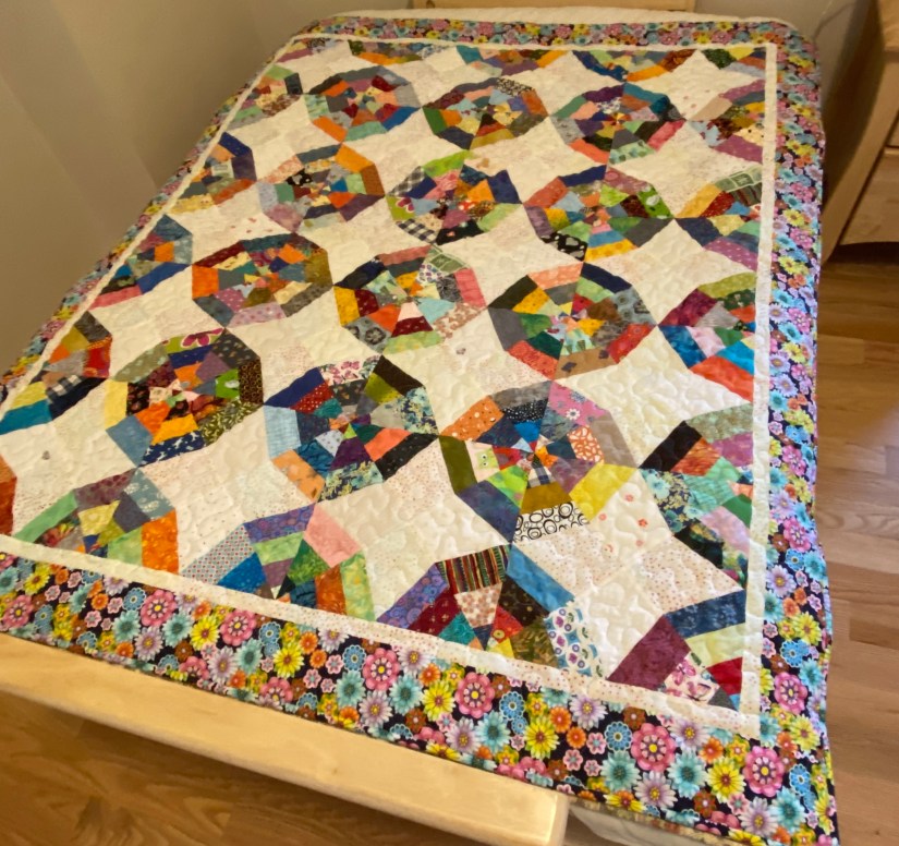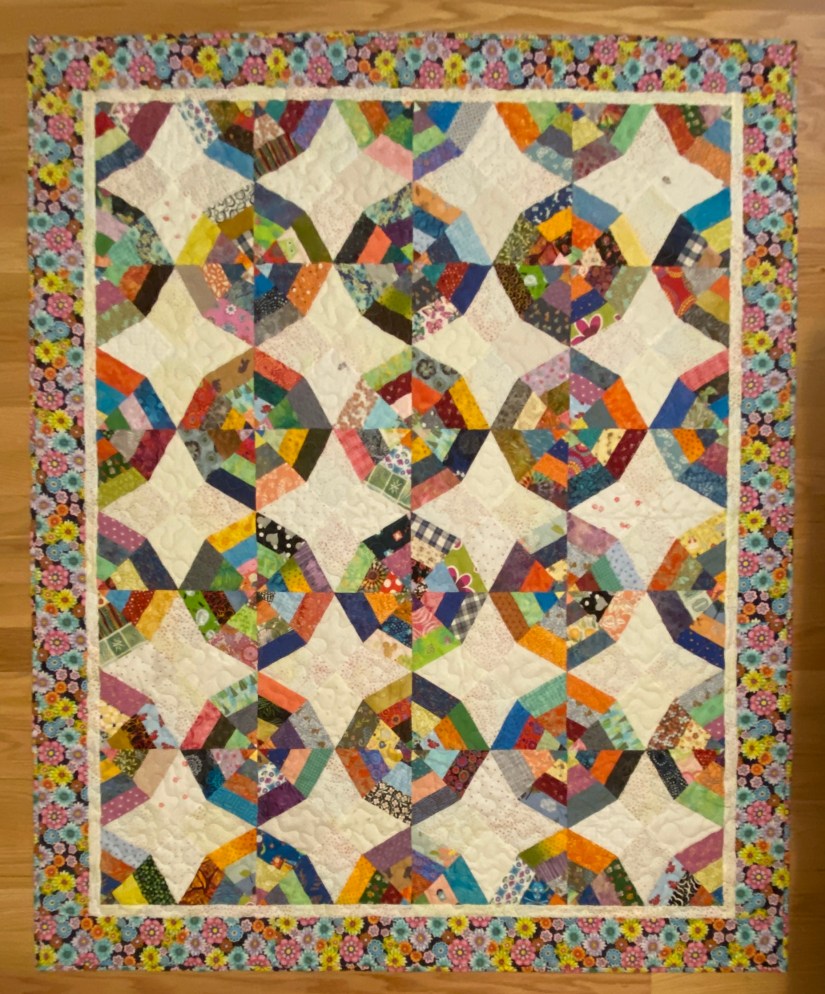 Some time ago, I got an idea to make a scrappy spider web quilt. One of my favorite quilters, Amanda Jean of Crazy Mom quilts provided the inspiration. Even though she no longer writes about quilting, I see her posts on IG and she was making a mini version not too long ago. This pattern isn’t new, both Bonnie Hunter and MSQCo have one. So, armed with a Periwinkle template, I ordered Wacky Web triangle paper and promptly forgot all about both… Until this spring, when I found myself with overflowing bins of 2″ and 2.5″ strips, and decided that it would be the perfect time to make this quilt and de-stash my scraps!