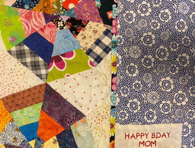 I’ve added borders and removed the bottom row of blocks, making the finished size 58″ x 70″, perfect throw size! The leftover 16 blocks are currently homeless. I decided on one piece backing – left pic below and wool batting. Its soft and snuggly and perfect for my Mom!