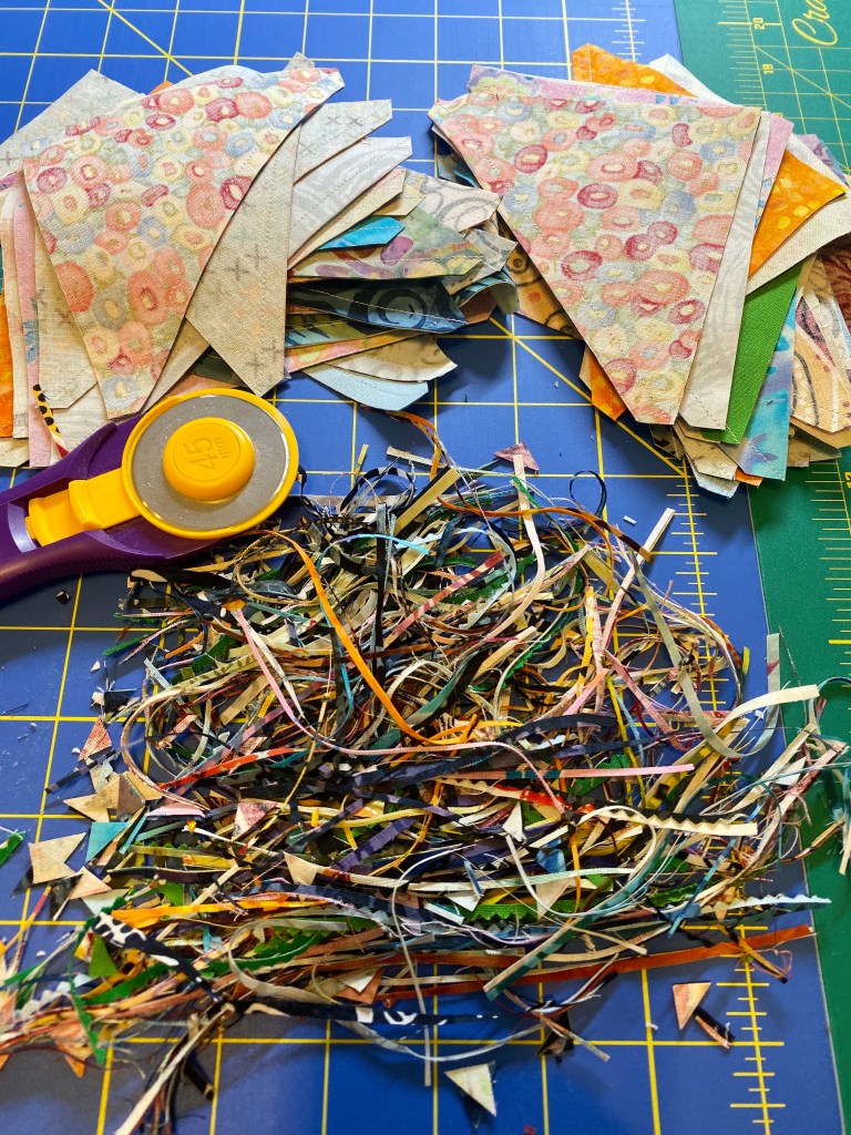 One evening I went thru my bin of 5” blocks and made 68 HTSs. It only took a little over an hour to select the fabrics and make all the blocks. I grouped them into sets of four to make 17 – 4 patch blocks.