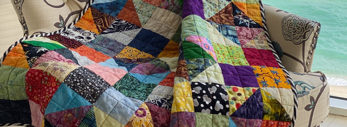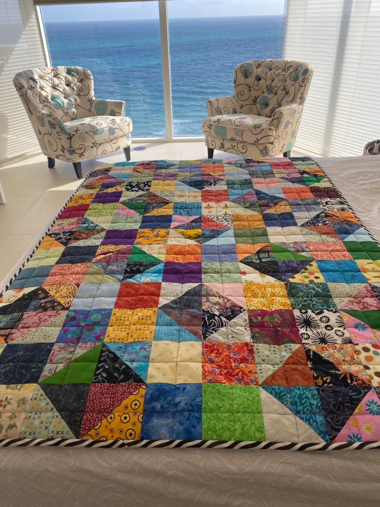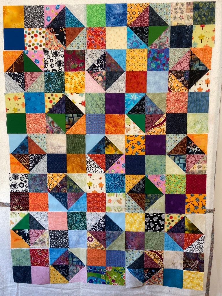 The rest was easy – just lay out all the blocks, then make all the 4-patches! I spun the seams on the back of the 4-patches to make seams flatter and then joined the blocks into rows and rows together to complete the top. That’s two more evenings and the top was done! Total time 5 hours!