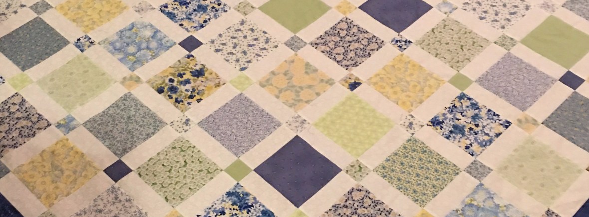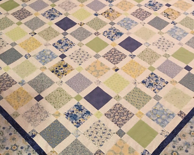 I used 25 fat quarters of prints and about 3 yards of white on white fabric with pineapples for sashings. Cornerstones were made from the leftover strips. It has 1″ dark blue inner borders and 6.5″ outer borders.